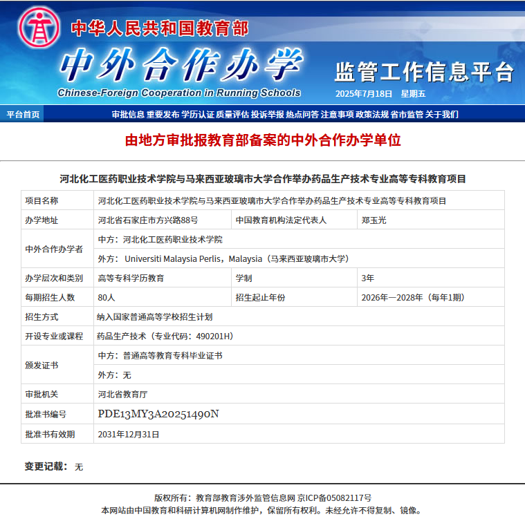 近日,教育部公布了2025年中外合作办学项目的评审备案结果。马来西亚玻璃市大学与河北化工医药职业技术学院合作举办药品生产技术专业专科教育项目在历经严格评审后,凭借突出的优势顺利通过评审答辩,成功获批并备案通过,标志着两校在国际教育合作层面迈出了坚实的一步。